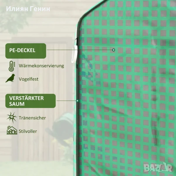 Ролетна врата и прозорци: Голямата ролетна врата с цип осигурява лесен достъп до вашата градинска оранжерия, а мрежестите прозорци предпазват от нежелани крилати гости. Множеството отвори позволяват кръстосана вентилация, което ви позволява сами да регулирате температурата и влажността