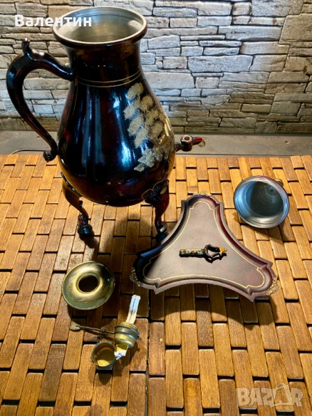 Античен буйот в пълен комплект, включително алкохолна горелка за поддържане на температурата на водата. Производител Kurz Tiel edeltin Холандия. Компанията е основана през 1896 г. Започва производство на калай през 1935 г.