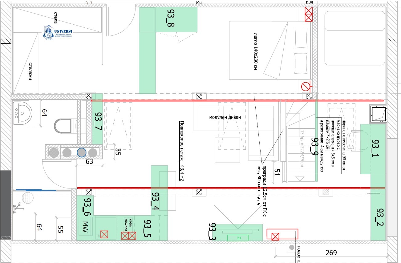 Къщата се състои от три нива, от които две са жилищни, а последното е тип подпокривно, което е реализирано като мансардно ателие.