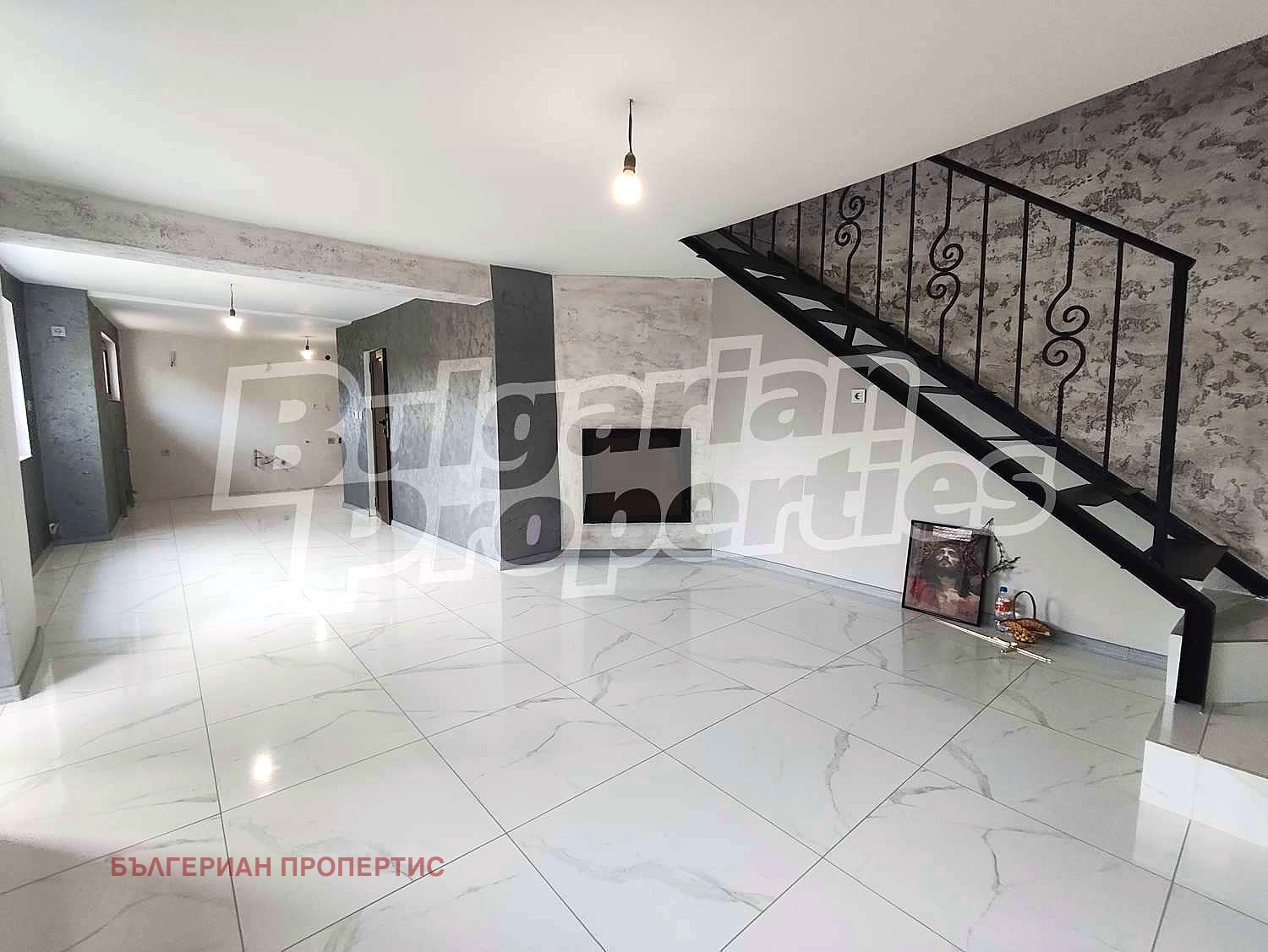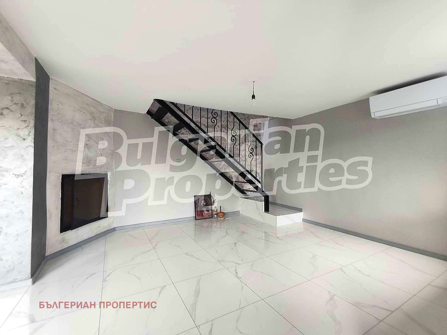 Първи етаж - общо помещение за кухня и всекидневна, предвидено място за камина с водна риза, с прокарани тръби, като към момента има климатик, предвиден за помещението. Вътрешни стълби.