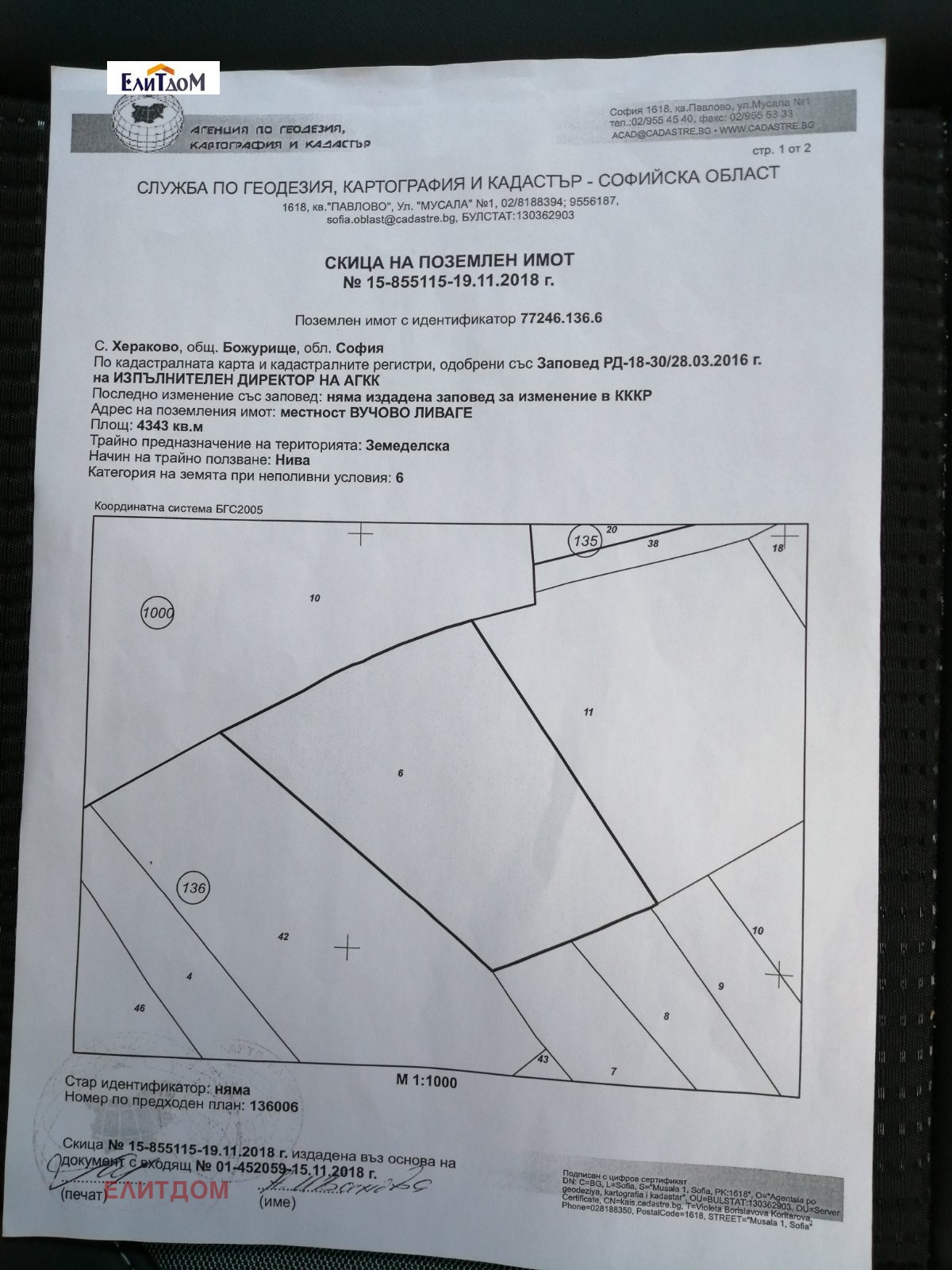 Елитдом Ви предлага поземлен имот, нива, категория 6 при неполивни условия, с площ 4343 кв.м с отлична локация и до регулация, което позволява лесно преустройство. Намира се в местност Вучово ливаге, с.Хераково, общ. Божурище, обл.София.