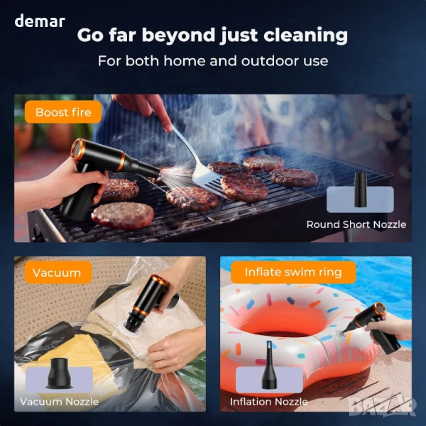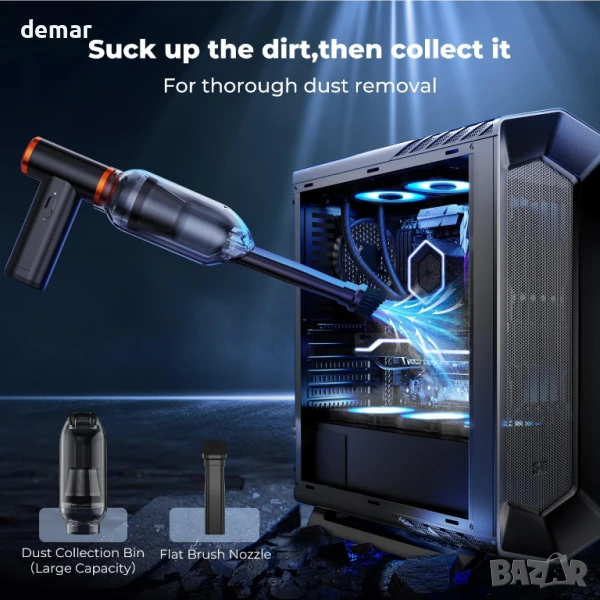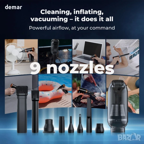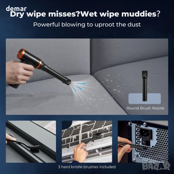 Тази електрическа безчеткова четка за прах съчетава мощно издухване и засмукване в един компактен инструмент, оборудван с дълготраен безчетков мотор със скорости до 300 000 оборота в минута и сила на вятъра до 200G. Предлага се с 9 дюзи, 3 четки, 5 кърпи и инструмент за издърпване на клавиатура за многостранна употреба върху електроника, автомобили, дома и оборудване за дейности на открито. Акумулаторна и екологична, тя замества еднократните въздушни кутии, спестявайки пари с течение на времето. Лека и преносима, тя е идеална както за почистване на закрито, така и за пътуване.