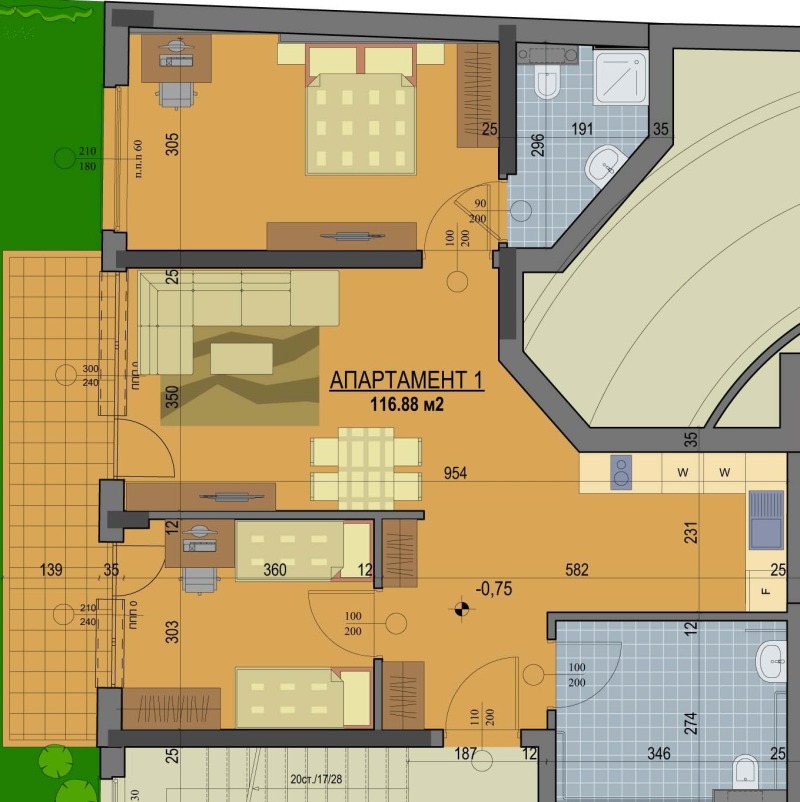 Тристаен апартамент в новострояща се жилищна сграда в широк Център на град София, квартал Банишора. Апартамента се състои от дневна, кухня, две спални, два санитарни възела, коридор и веранда. Изложение запад. Сградата е седеметажна с луксозни общи части: