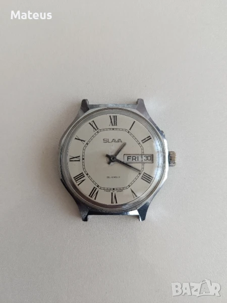 Руски механичен часовник Слава,(26 камъка).В добро визуално състояние,работещ,но се нуждае от профилактика,сменя ден и дата,липсва секундарната стрелка.За ценители и колекционери...
