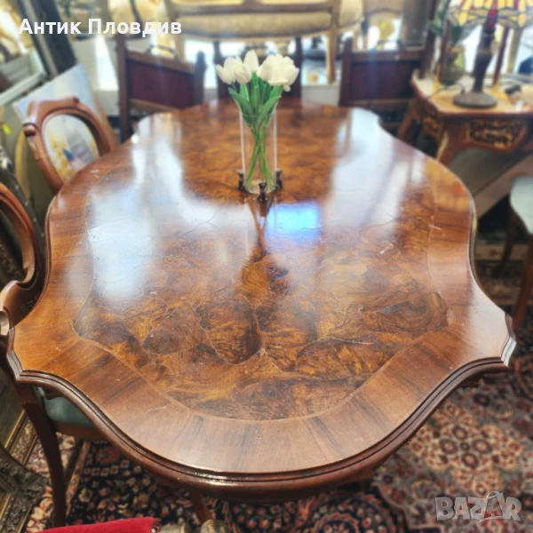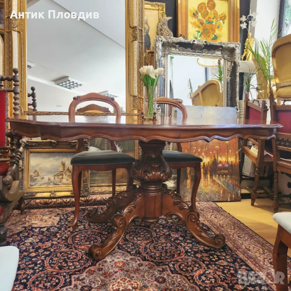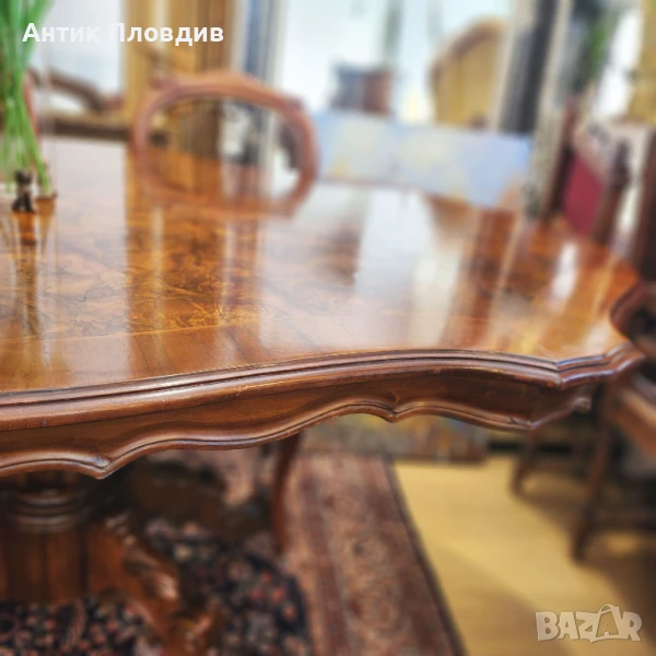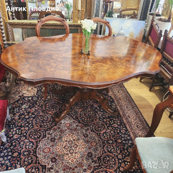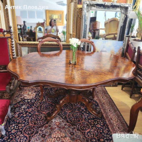 Изящна антикварна маса в стил Луи Филип, отличаваща се с богато резбована централна основа и солидна конструкция от масивно дърво. Плотът е с елегантна форма и изразителен фурнир с естествени шарки, който придава топлина и характер на цялата композиция. Масата съчетава декоративна стойност с практичност, подходяща както за класически интериори, така и за стилен акцент в съвременна обстановка.