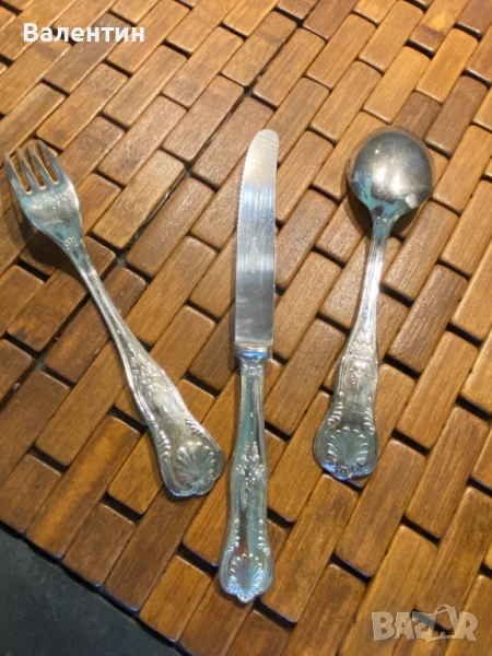 Комплект прибори за хранене. Посребрени. Италия. 3 предмета. Средата на 20-ти век. Добро състояние.Ако се интересувате, има още около 10 от тези комплекта налични. При продажба заедно има прилична отстъпка. Но това няма да е пълен комплект за 12 души.