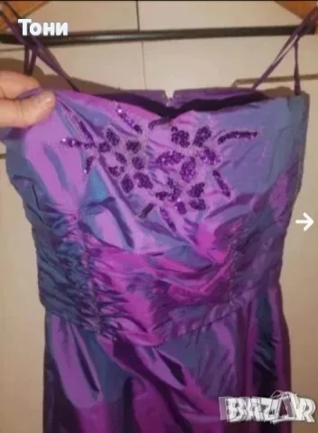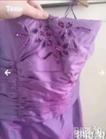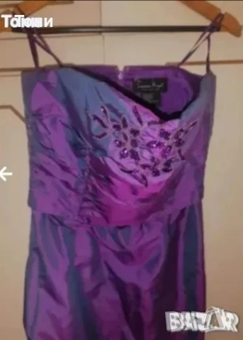 Чисто нова официална рокля в нежно, преливащо се лилаво в синьо. Много ефирна. Украсена с бродерия от блестящи пайети.