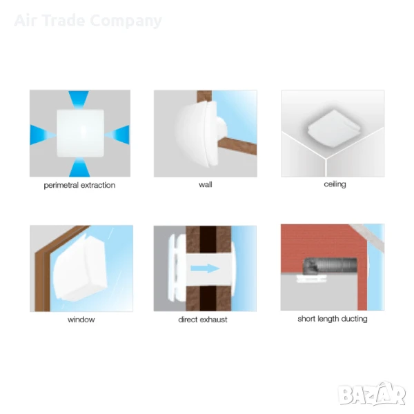 Корпусът е изработен от висококачествен ABS и осигурява дълготрайна удароустойчивост и здрава конструкция. Този тип вентилатори се предлагат в бял цвят RAL 9010 и са устойчиви на UV лъчи. Уникален дизайн на лопатката на ротора, осигуряващо подобрени аеродинамични свойства, ниски шумови нива и повишена ефективност. Еднофазен индукционен двигател с вградена термозащита, монтиран на запечатани висококачествени сачмени лагери. Подходящ за непрекъсната и прекъсната работа.