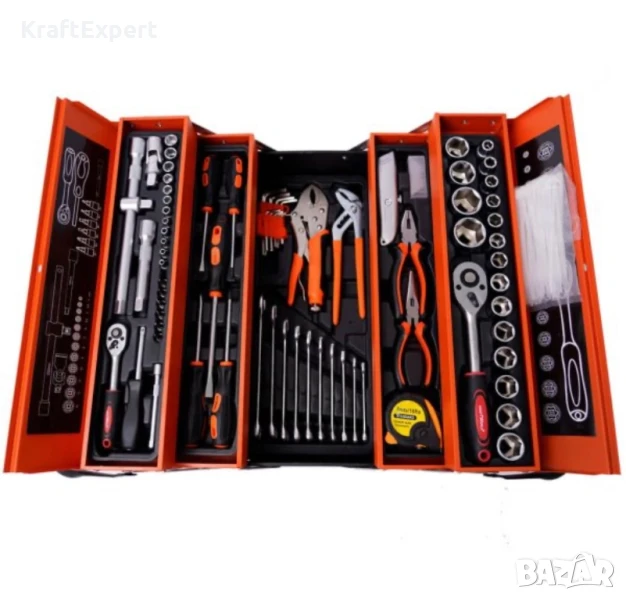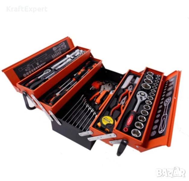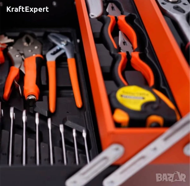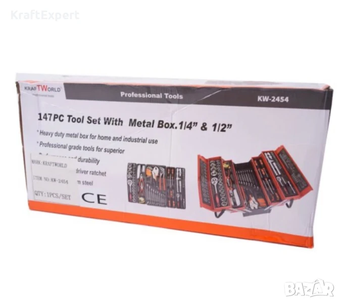 Ако търсите надежден и универсален комплект инструменти, KRAFT WORLD предлага 147 части, необходими за ремонтни и строителни дейности. Изработени от здравa хром-ванадиева стомана, инструментите осигуряват издръжливост и дълъг експлоатационен живот. Металният куфар позволява лесно съхранение и транспорт, като всички инструменти са организирани в отделения за максимално удобство.
