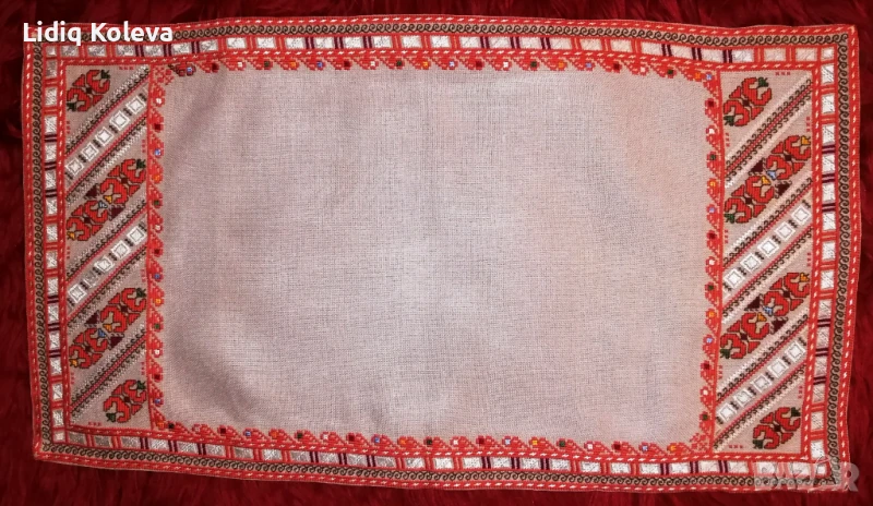 Ръчно изработена правоъгълна покривка, българска бродерия, на ленена панама с размери 75/42 см. Цена 60 лв. Изпращане по Спиди.