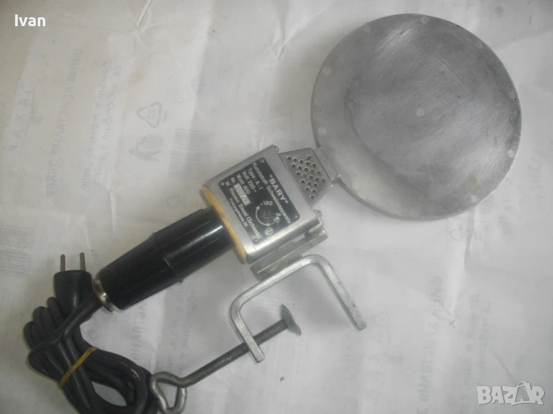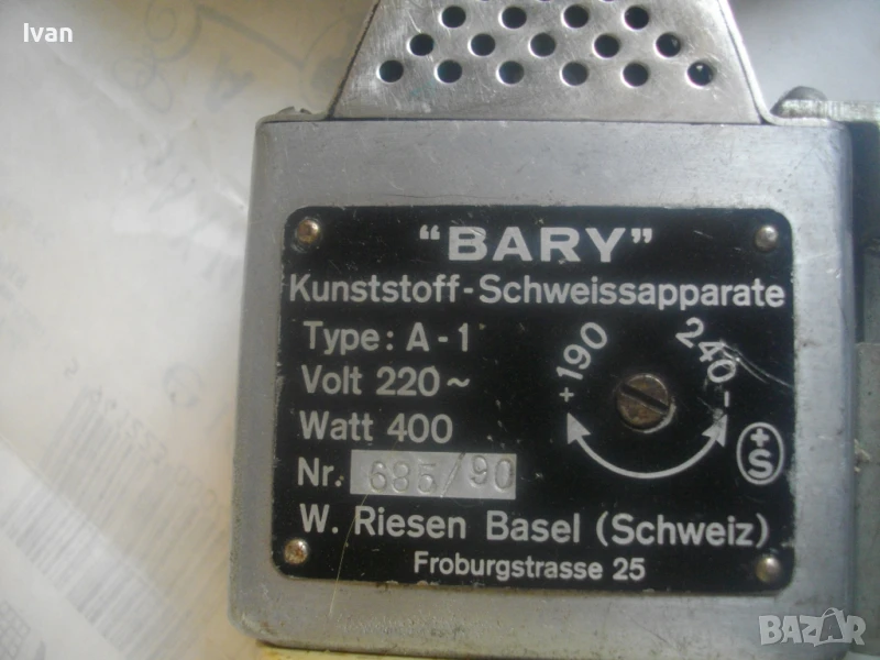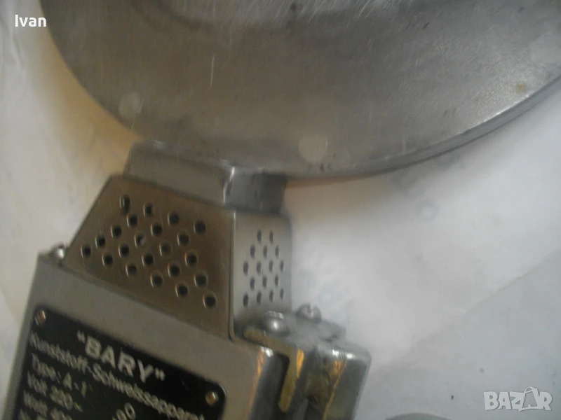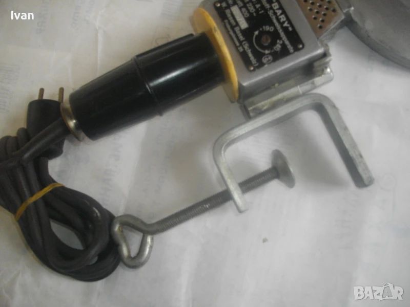 Масивна голяма електрическа лепачка поялник за пластмасови тръби с голям диаметър до ф190 мм. Инструментът е старо швейцарско качество висок клас. Марка и модел тип BARY Type A-1. Производство 1990г. Производител W. Ressen Място производство Bassel - Швейцария. Лепачката е в отлично работно техническо състоняие и много запазено визуално състояние. Работи много добре. Характеристики: