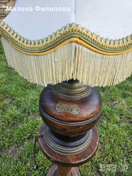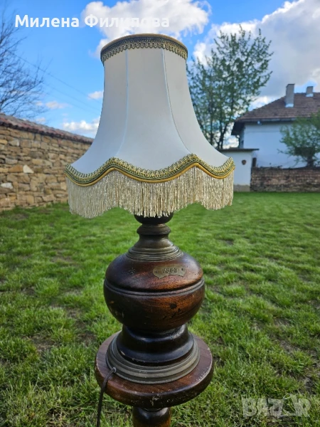 Старинна лампа, абажур с ресни. Дърво и месинг.