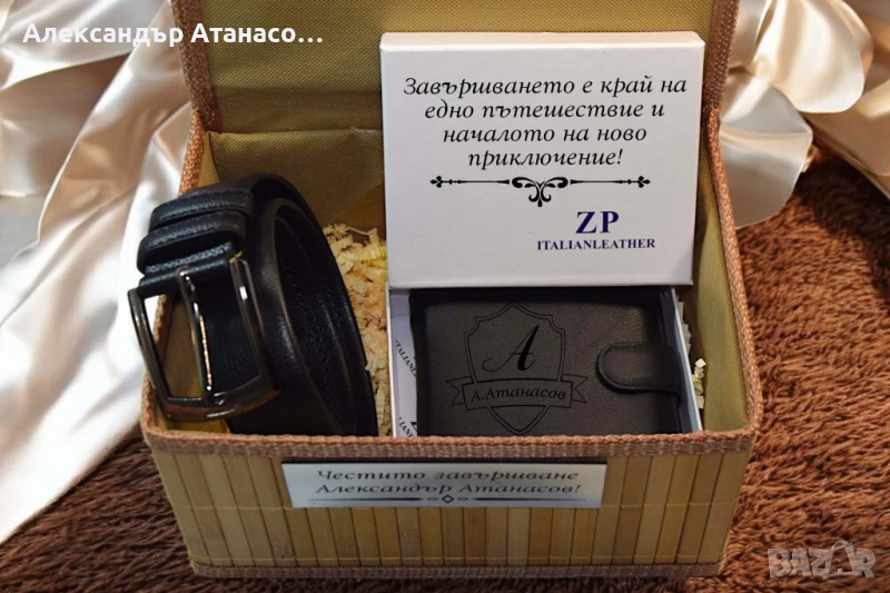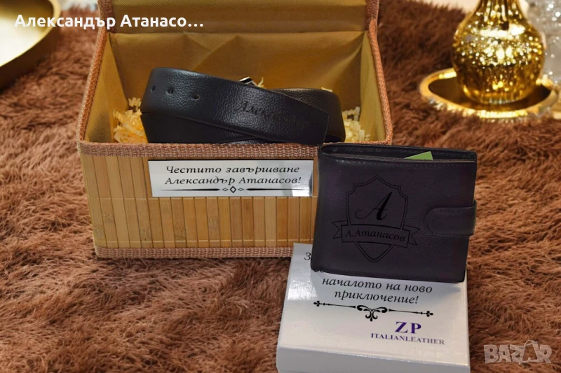 Мъжки и дамски портмонета, чаши и колани с подаръчна бамбукова кутия.