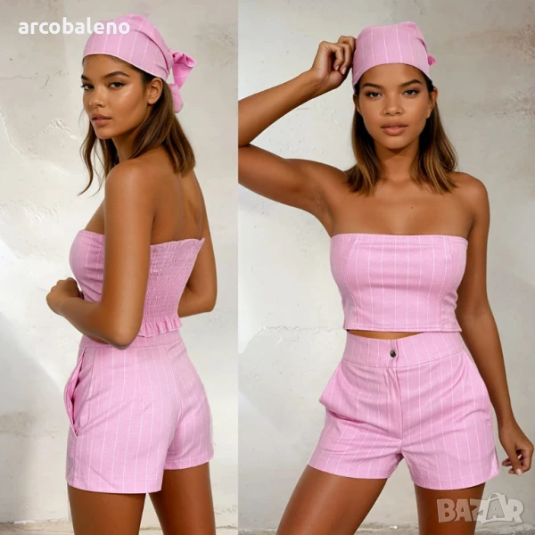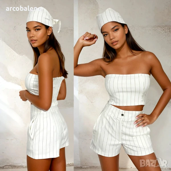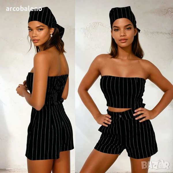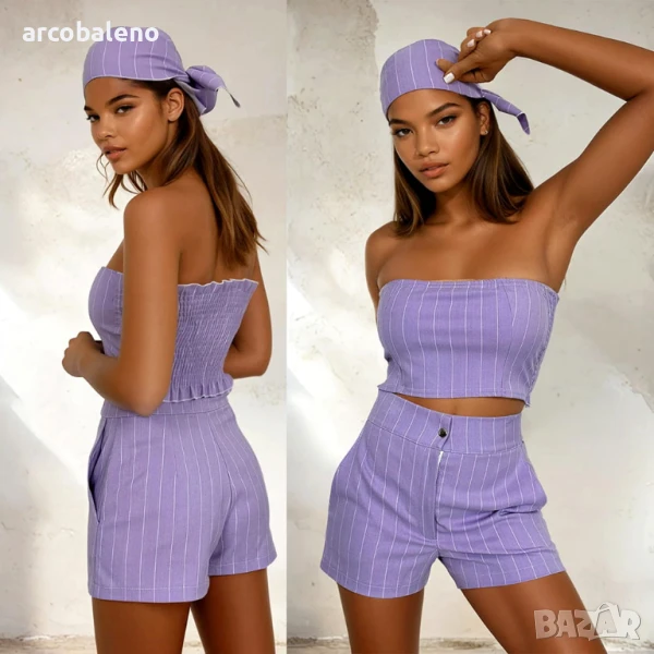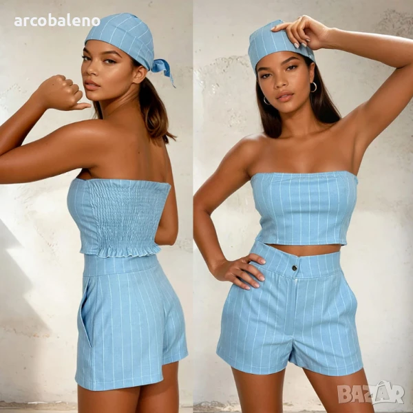 Летен комплект на райета – забрадка, топ без презрамки и шорти. Лек, удобен и стилен комплект, който създава перфектния стил за топлите дни. Ще бъде подходящ както за плажа, така и за летни разходки в града.