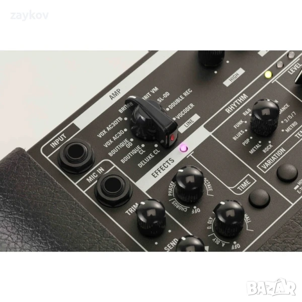 Този усилвател е лек, компактен и може да се захранва от мобилна батерия. Той също така предлага мощни и реалистични модели усилватели, както и новоразработен вокодер за говорещи модулационни ефекти, вградени ефекти, които ви позволяват да създавате разнообразна гама от звуци, вход за микрофон, AUX вход, жак за слушалки и ритъм машина, която може да възпроизвежда модели на гърба от много жанрове.Модели на усилвателиНастройката LINE е полезна при включване на електрическа акустична китара или клавиатура.Добавен е нов и уникален VOCODER за ефект на „говореща модулация“, който можете да използвате, като свирите на китара заедно с микрофона (Може също да звучи уникално дори без микрофона.).DELUXE CL, BOUTIQUE CL, BOUTIQUE OD, VOX AC30, VOX AC30TB, BRIT 800, BRIT VM, SL-OD, DOUBLE REC, VOCODER, LINEЕфектиЕФЕКТИ 1: ХОР, ФЕЙЗЪР, ТРЕМОЛО, ОКТАВАЕФЕКТИ2: A.DLY, DLY, ПРОЛЕТ, ЗАЛАРитъм машинаИма три вариации за всеки жанр, за общо 33 вида ритмични модели.Модели: РОК, МЕТАЛ, ПОП, БЛУС, ФЪНК, R&B, ДЖАЗ, ЛАТИНО, ДЕНС, 3/5/7, МЕТРО