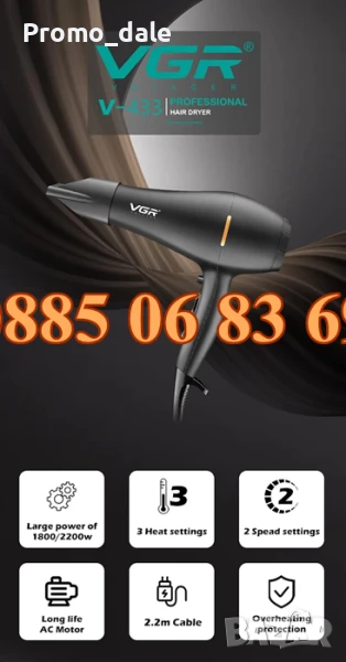 Спестете ценно време сутрин или вечер, като изберете VGR V-433 1800 до 2200 вата професионален сешоар с 2 скорости + 3 настройки за нагряване и бутон за охлаждане, който фиксира стила на място. Усъвършенстваната Nano Ionic технология заедно с постоянен силен въздушен поток, който идва от професионалния мотор, ще направят косата ви копринено гладка, без влага.