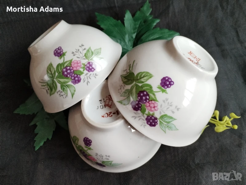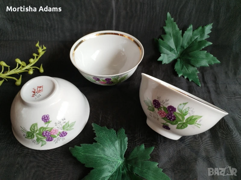 🌿 Комплект от три супер чаровни съветски купички с двустранен декор "Къпини", Туймазинский фарф. завод. Заводът е използвал само една маркировка. Първите му изделия са пуснати в продажба през 1978г.