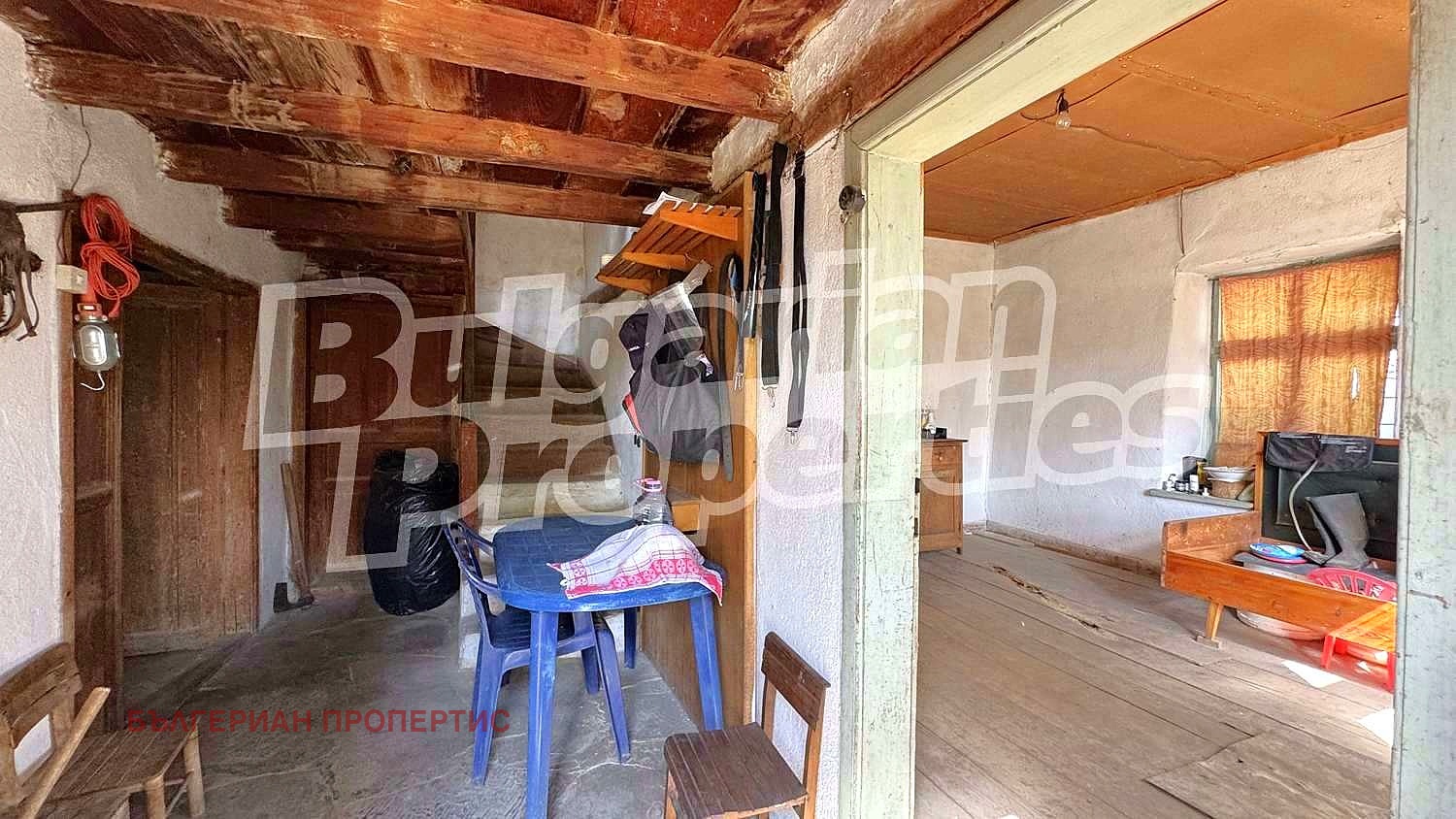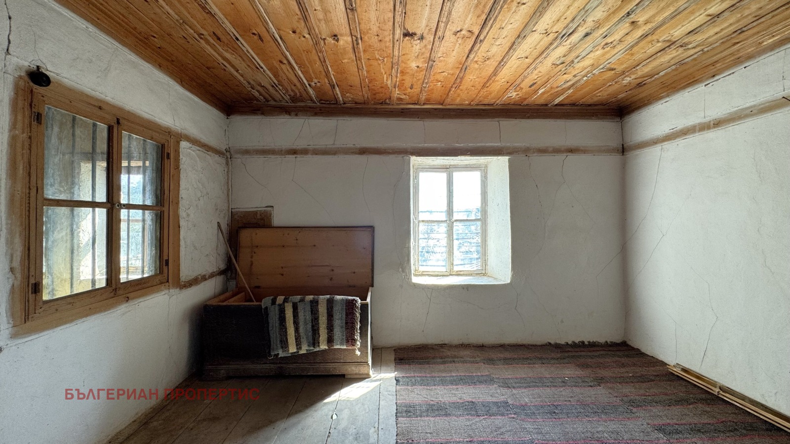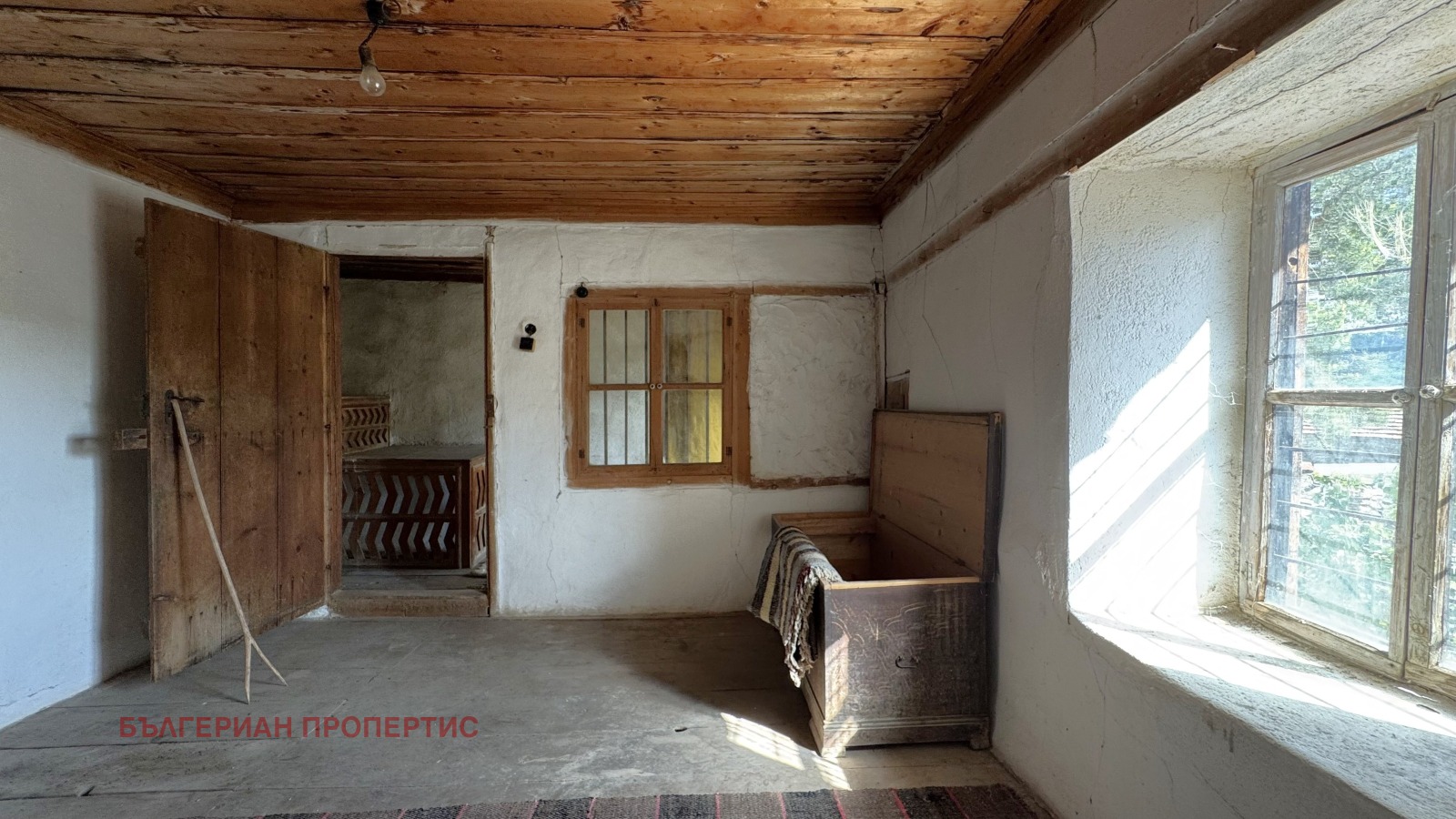 Прозорците са с дървена дограма, стени - камък, подовете на замазка и дюшеме.
