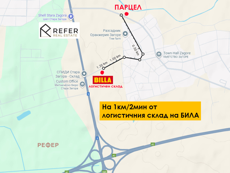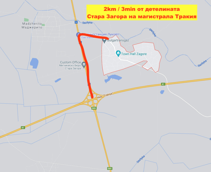 Продава се УПИ - имот вкаран в регулация в района на село Загоре с 100 метра лице на асфалтов път. С директен достъп до вода, газ и електричество. Намира се на 2 минути разстояние от магистрала Тракия. На 2 минути и от логистичния склад на БИЛА. Отлично предложение за логистичен хъб или производство устройствена зона Пп. Кинт 2.5 плътност 80% и кота корниз 15 м. В имота има сервитут образуван от преминаване на електропроводници и газопровод. Образуват се три големи петна за застрояване - видно от приложената скица.