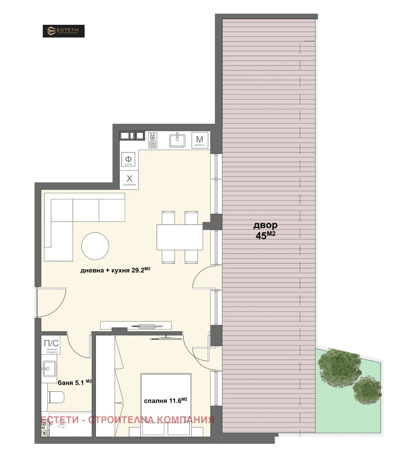 🏠Двустаен апартамент, състоящ се от антре, дневна с кухня, спалня, баня с тоалетна, двор с площ- 45.00кв.м. Квадратура - 64 кв.м.