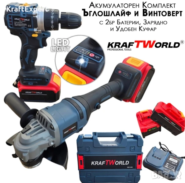 Акумулаторен Винтоверт и Безчетков Ъглошлайф KraftWorld