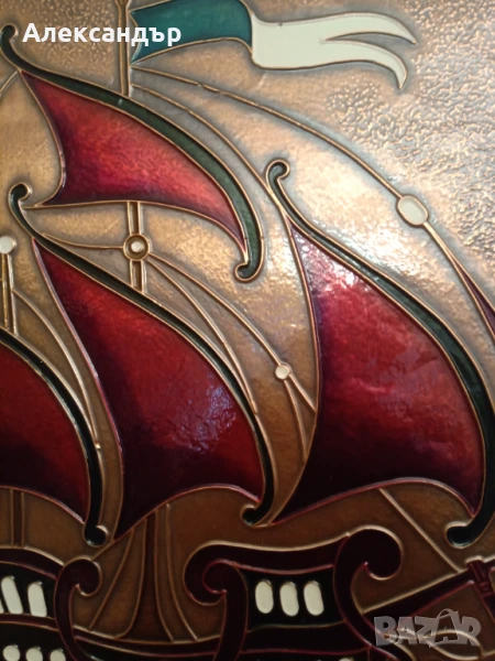 Голямо старо гръцко пано. Основа от дърво, ръчно кована мед и емайл. Изключилна и ефектна красота. Много релефно. Подходящо за дом, офис, ресторант ,хотел. Размери 71 см. 56 см.