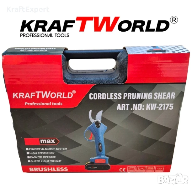 ✅ 36 Месеца гаранция ✅ 2 Батерии✅ Мощност и Прецизност за Рязане до 30мм✅ Удобрен Преносим КуфарАкумулаторна Градинска и Лозарска Ножица KraftWorld с 2 Батерии- Мощност и Прецизност за Рязане до 30ммАкумулаторната безчеткова ножица KraftWorld 36V е мощен инструмент, идеален за професионалисти и градинари. С максимален диаметър на рязане от 30 мм и регулируемо отваряне на ножовете, тя осигурява прецизност и комфорт дори при труднодостъпни места. Оборудвана с две Power Share батерии, съвместими с всички инструменти от серията, ножицата предлага дълготрайна работа без прекъсвания. Лек и ергономичен дизайн гарантира минимална умора, а висококачествените остриета правят всеки разрез гладък и прецизен.Допълнителноможеда закупите резервен нож на Промо цена от 15лв (редовна цена – 19лв)Технически параметри:Напрежение на батерията 24V,Капацитет на батерията 2AhМакс. капацитет за рязане 33 mmМакс. отваряне на ножицата 54 mmТегло без батерия: 640гр.Тегло с батерия: 920гр.Комплектът съдържа:Акумулаторна Безчеткова Ножица KRAFT WORLD: 1брБатерия 8Ah: 2брЗарядно: 1брКуфар: 1брУпътване: 1брПОДАРЪК: точило и масло: 1бр