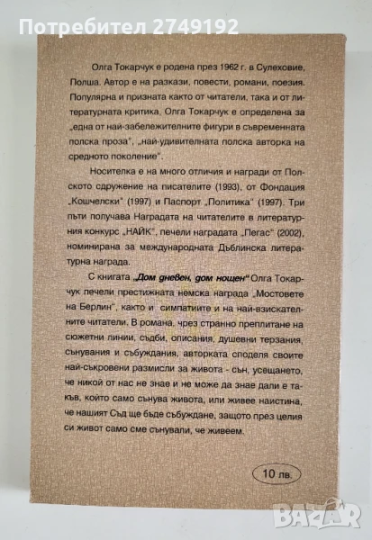 Финалист за Международна дъблинска литературна награда и носител на най-престижната полска литературна награда Нике (в категория Награда на публиката), "Дом дневен, дом нощен" е амбициозен литературен проект, който надскача жанрови и стилистични граници. С щипка магически реализъм и изкусен психологически писец, този фасетъчен роман прониква под привидността, за да прикове читателското съзнание в пулсиращи парчета картини от човешки животи. Историите на героите, привидно разпръснати, чертаят карта от деликатни връзки, която само най-смелите читатели са готови да следват.