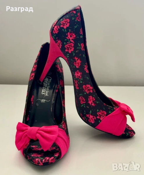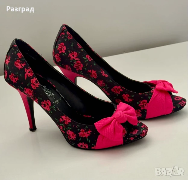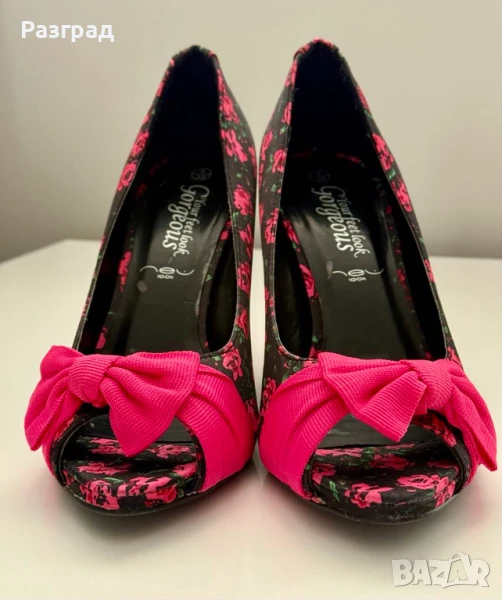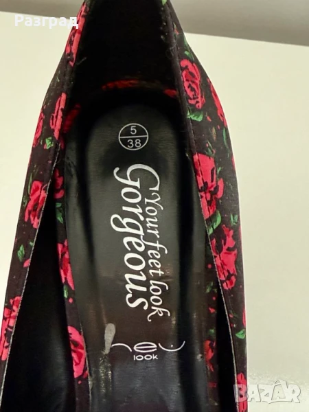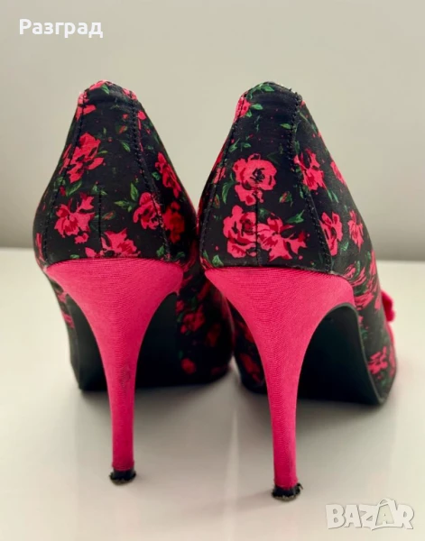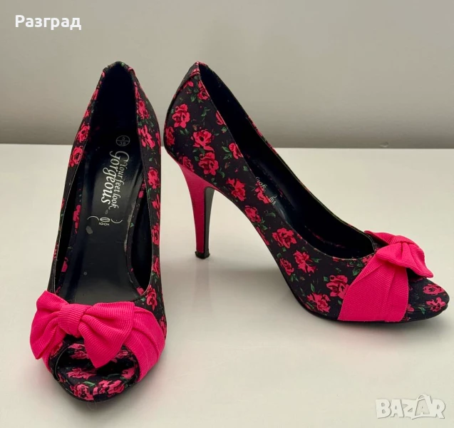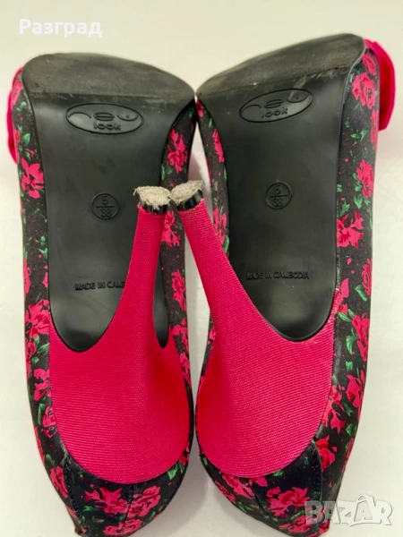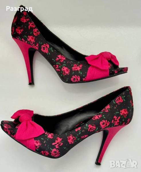 Височина на тока -10см. С малка платформа в предната част при пръстите, осигуряваща комфорт при наклона на ходилото. Външната част е флорален черен сатен, с розова панделка и ток.