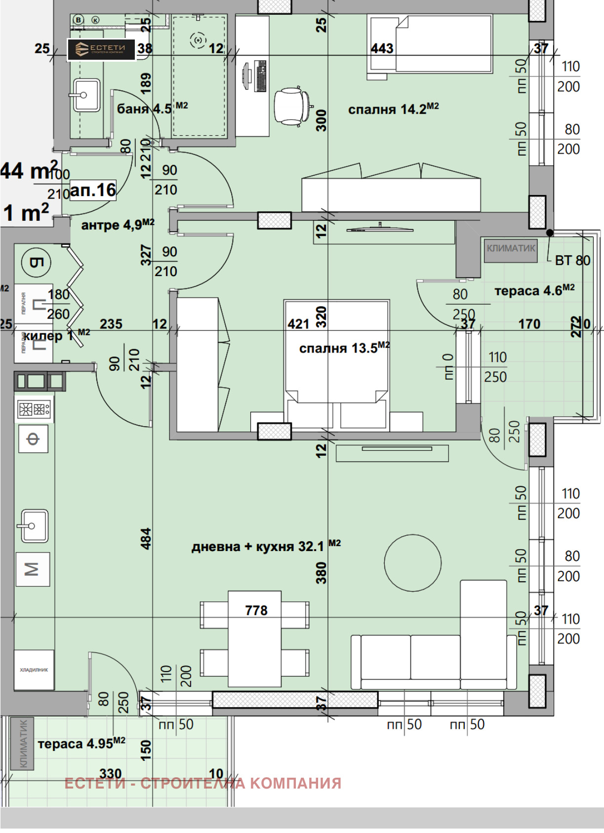 🏠 Тристаен апартамент, състоящ се от: антре, дневна с кухня, 2 спални, баня с тоалетна, килер, 2 тераси. Квадратура: - 110 кв.м.
