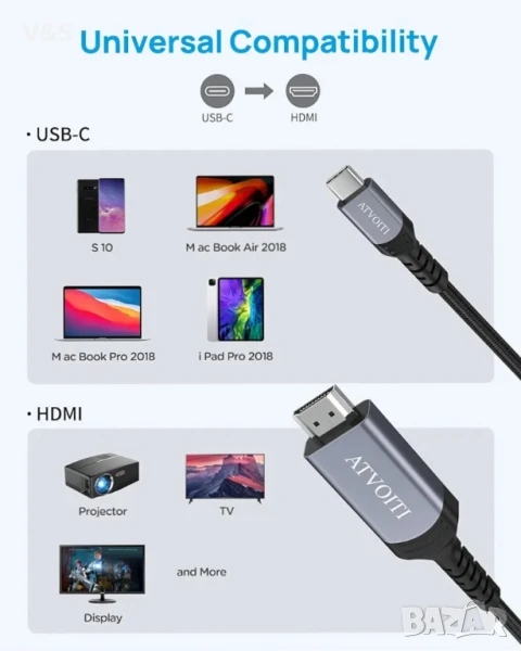 USB-C към 4K HDMI кабел: Тип-C към HDMI кабел може лесно да свърже вашето USB-C устройство, за да гледате филми, спортни събития, игри и снимки директно на вашия HDMI HDTV/монитор/проектор, което ви позволява да се наслаждавате на видео с ултра висока разделителна способност на по-голям екран.