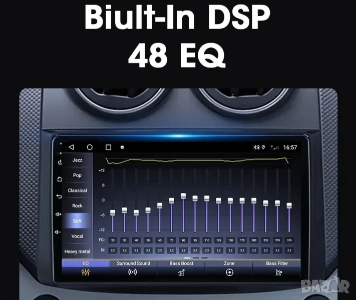 Wi-Fi интернет, новият Андроид, Bluetooth за разговори и музика, USB входове за флашка и зареждане на устройства, GPS навигация, теми за вид на меню, еквалайзер за настройка на звука, бърза реална RAM памет от ново поколение. ТОП дизайн!
