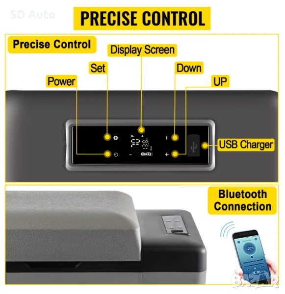 ***Трислойната защита на батерията може да предотврати изтощаването на батерията на автомобила от хладилника.Може да се регулира температурата и режима чрез цифровия панел, което позволява наблюдение на температурата и производителността по всяко време. Можете също да използвате мобилното приложение, за да контролирате температурата.