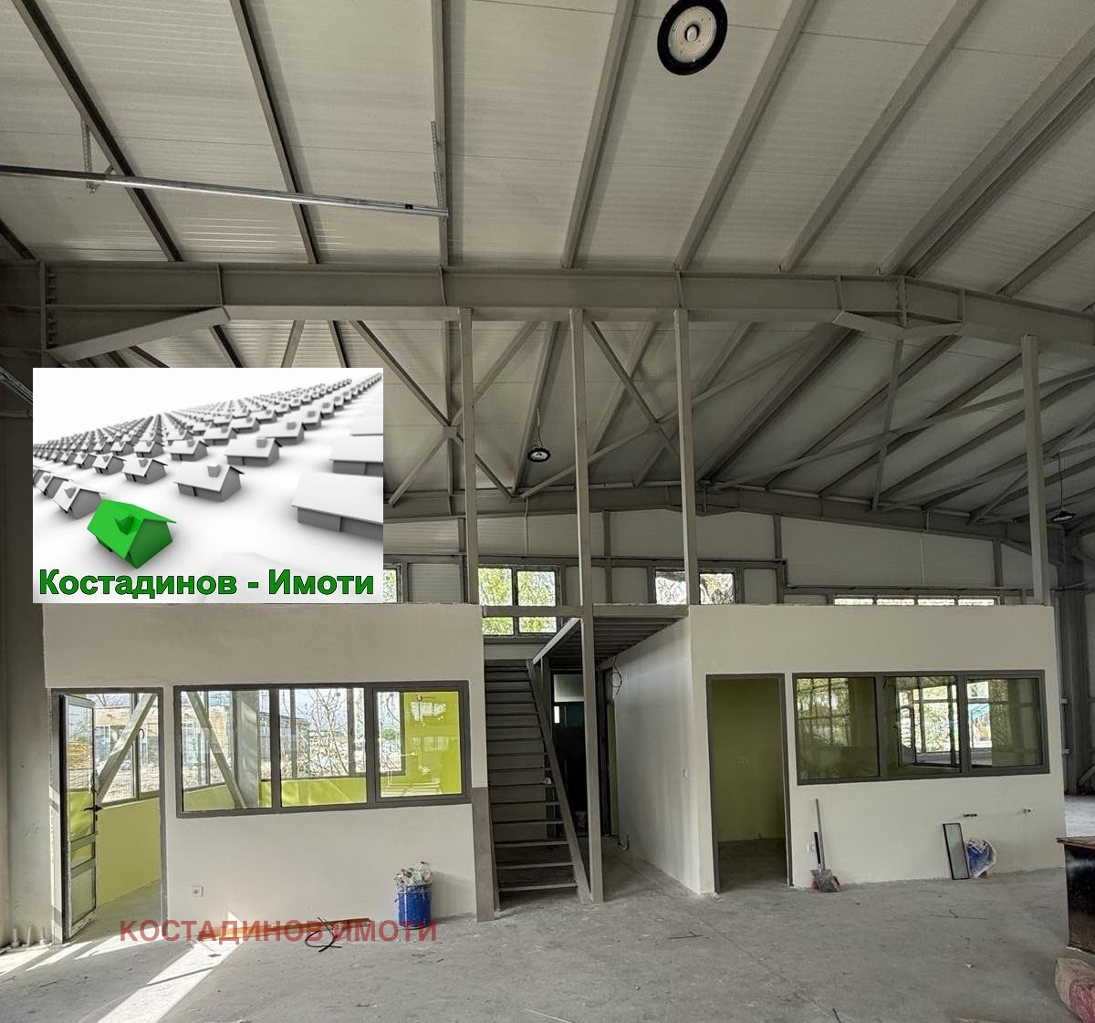 автосервиз или производствена база. Разполага с две огледални офисни части с обособени санитарни възели с бани, кухни и офисни помещения, което позволява да бъде разделено и да се ползва необезпокоявано от всеки от отделните наематели. Поставени са товарни ролетни врати, има паркоместа, трифазен ток и др.