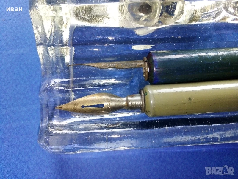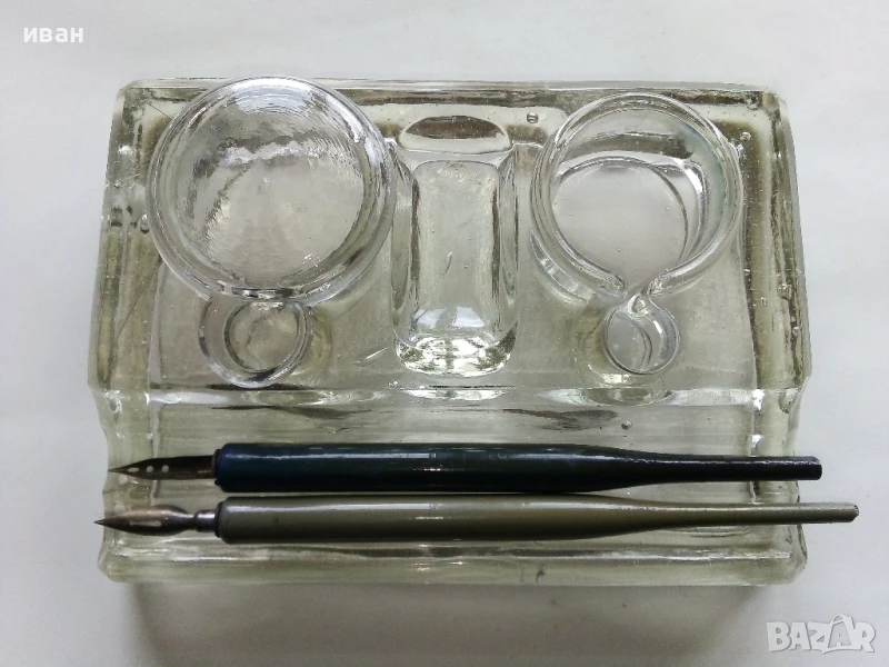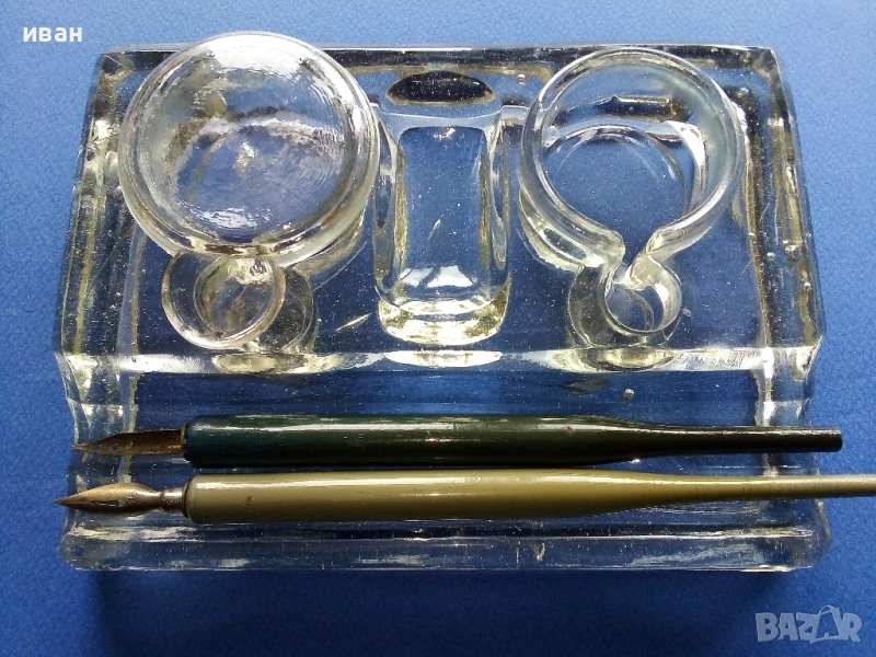 Стара стъклена мастилница + две писалки → Обява 50486629