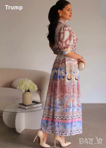 Елегантна дълга .окля, нежен десен, с колан облечен със същия плат