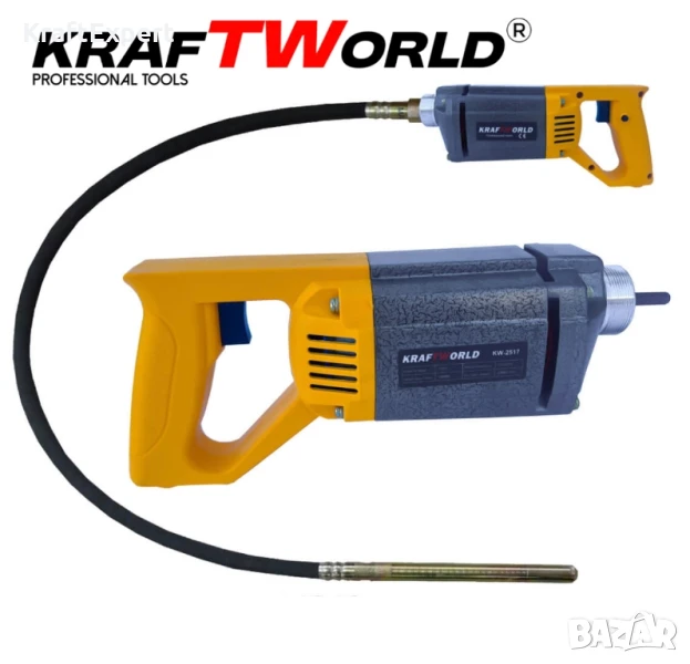 вибратор за бетон KraftWorld 1800W. Това високоефективно устройство е създадено да отговори на нуждите на съвременните строители, осигурявайки оптимална плътност и хомогенност на бетоновата смес.Защо да изберете KraftWorld ?При полагането на бетон често се образуват въздушни мехури, които могат да компрометират здравината и дълготрайността на конструкцията. С KraftWorld 1800W лесно ще елиминирате тези нежелани празнини, като постигнете плътен и устойчив бетон, готов да устои на изпитанията на времето.Ключови характеристики:Мощност: 1800WНапрежение: 230VОбороти в минута: 4500 об/минДължина на гъвкавия вал: 2 метраДиаметър на иглата: 35 ммПредимства на продукта:Висока производителност: С мощност от 1800W и 4500 об/мин, устройството гарантира бърза и ефективна работа, спестявайки ви време и усилия.Гъвкавост и удобство: Гъвкавият вал с дължина 2 метра позволява лесен достъп до труднодостъпни места, осигурявайки равномерно уплътняване на бетона във всяка точка.Универсалност: Подходящ за разнообразни приложения, включително изливане на тавани, подове, фундаменти и фундаментни стени, което го прави незаменим инструмент за всеки строителен обект.Дълготрайност: Изработен от висококачествени материали, вибраторът е проектиран да издържа на интензивна употреба, гарантирайки ви дълъг експлоатационен живот.Приложения:Изливане на тавани и подове: Постигане на гладка и равномерна повърхност без въздушни мехури.Фундаменти и фундаментни стени: Осигуряване на максимална здравина и устойчивост на основите на сградите.Колони и подпорни стени: Гарантиране на хомогенност и плътност на вертикалните елементи на конструкцията.Как работи?Игленият вибратор за бетон използва високочестотни вибрации, предавани чрез гъвкавия вал и иглата, които проникват в прясно положения бетон. Тези вибрации предизвикват реорганизация на частиците в сместа, като изтласкват въздушните мехури към повърхността и позволяват на бетона да се уплътни по естествен начин. Резултатът е по-плътен, по-здрав и по-устойчив бетон, който отговаря на най-високите стандарти в строителството.Защо качеството на бетона е от значение?Качеството на бетона е критично за дълготрайността и безопасността на всяка конструкция. Неправилно уплътненият бетон може да съдържа вътрешни дефекти, които да доведат до намалена носимоспособност, поява на пукнатини и влошаване на материалите с времето. Използването на иглен вибратор като KraftWorld 1800W минимизира тези рискове, осигурявайки ви спокойствие и увереност в здравината на вашите строителни проекти.Инвестирайте в KraftWorld 1800W и се уверете, че вашите бетонни конструкции са изградени с най-високо качество и внимание към детайла. Това е инструментът, който всеки професионалист и сериозен ентусиаст в строителството трябва да притежава.
