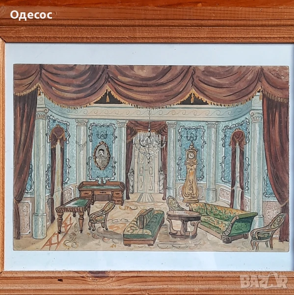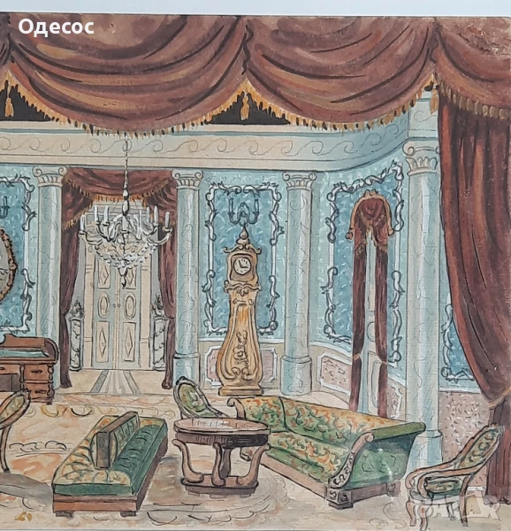 Стара картина,сценография на худ Евгений Петров Ващенко 1887-1979г. Сценограф,заслужил художник. Гваш,акварел,върху хартия. Размер 32/22см,без рамка и 42/34см с рамка.