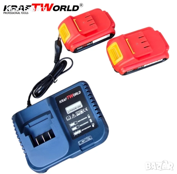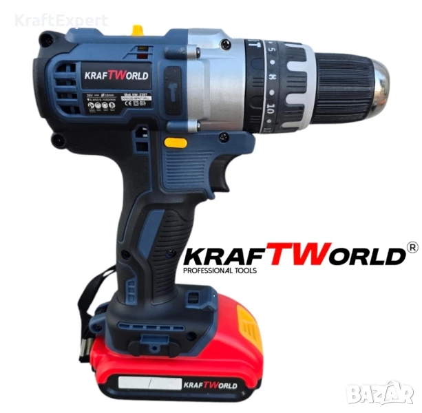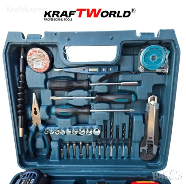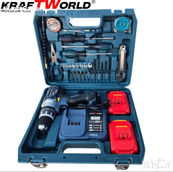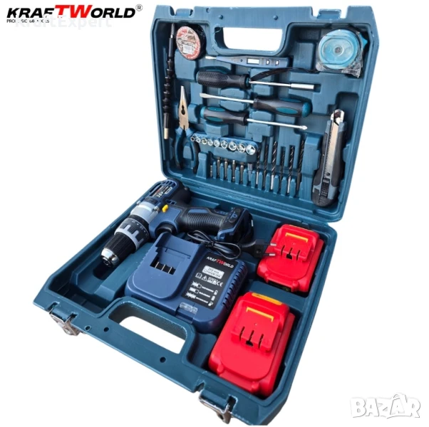 36 Месеца Гаранция – Спокойствие и надеждност при всяка работа✅ 2бр батерия – Дълготрайна и мощна за интензивна употреба✅ 16 регулируеми степени – Прецизност и контрол във всяка ситуация✅ Комплект с инструменти – Всичко необходимо за непрекъсната работаАко търсите мощен, издръжлив и многофункционален ударен винтоверт, който да ви помага в домашните и професионални ремонти, KraftWorld е перфектният избор! Със своите две мощни Li-Ion батерии, 16 настройки за регулиране и ударна функция, този винтоверт гарантира прецизност, надеждност и удобство при работа.Комплектът включва 30 допълнителни части – всичко необходимо, за да започнете работа веднага! Благодарение на ергономичния дизайн, удобния куфар за транспортиране и вграденото LED осветление, този инструмент е незаменим за всеки майстор. Независимо дали пробивате метал, дърво или работите с крепежни елементи – KraftWorld ще се справи с лекота!Основни характеристики:Напрежение: 24VКапацитет на батерията: 4Ah (4000mAh)Удари в минута: 0-25 500 об/минМаксимален въртящ момент: 47 Nm (твърд) / 14 Nm (мек)Патронник: 0,8-10 ммМакс. пробиване в метал: 10 ммМакс. пробиване в дърво: 19 ммВибрации при ударно пробиване: 8,0 м/с²Вградена LED подсветка за работа в тъмни условияКомплектът включва:✔ Акумулаторен ударен винтоверт✔ 2 x Li-ion батерии ✔ Зарядно устройство✔ Разнообразни аксесоари (бурги, вложки, накрайници и др.)✔ Куфар за удобно съхранение и транспортиранеС този продукт ще работите бързо, ефективно и без усилие! Подходящ е както за професионалисти, така и за домашни майстори. Поръчайте сега и получете всичко необходимо за безупречен резултат!