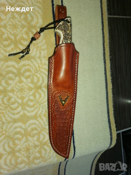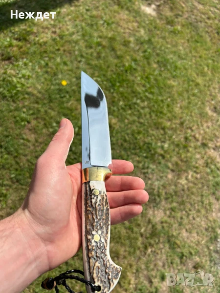 Ловен нож от n690 стомана закален на 61единици с крио от Капо. Дръжка от Еленови род и месингови гард. Размери на острието 170/37/4.3мм.Има кания от 3,5мм телешки бланк.