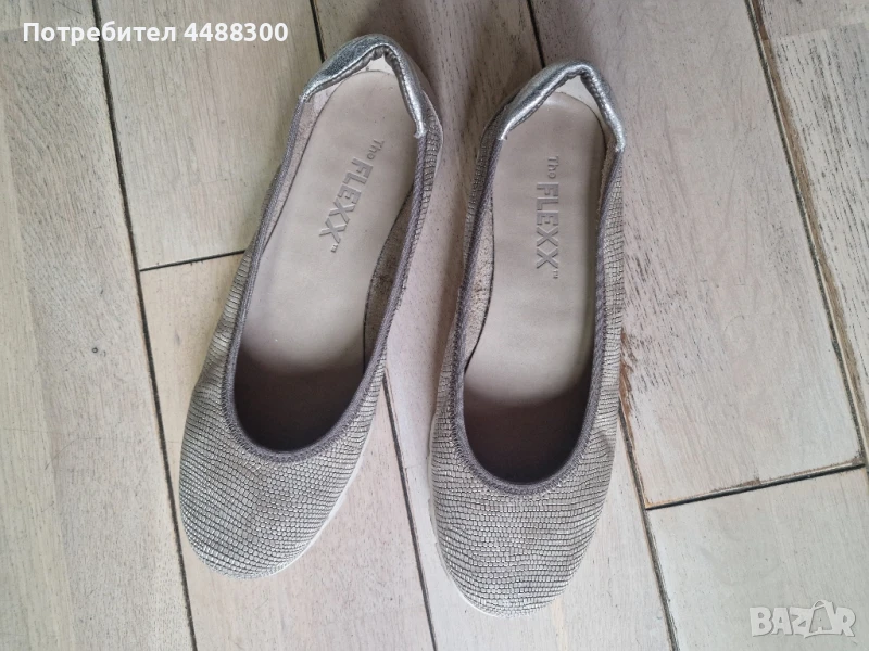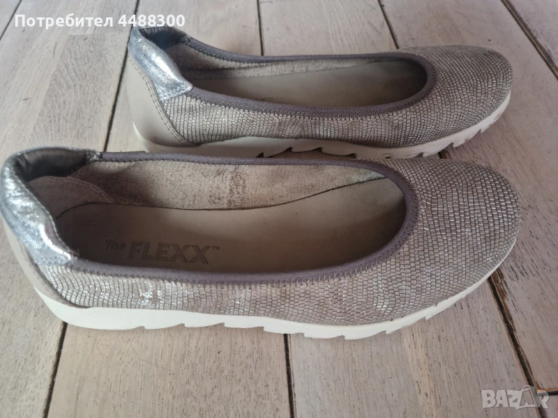 Уникални меки дамски обувки FLEXX в бежаво сребрист цвят. Изключително удобни и стилни, подходящи за всякакви поводи. Стилни, меки и удобни с ортопедична подметка, като пантовки.Размер 37, стелка измерена с ролетка 24смОт естествена кожа, отвън и отвътре.