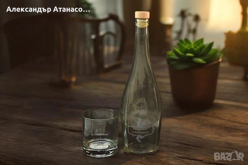 Стъклена бутилка за алкохолни напитки + Стъклена чаша за уиски.