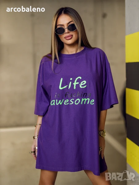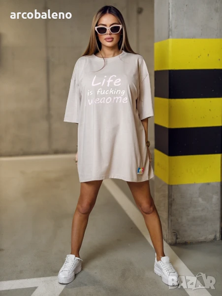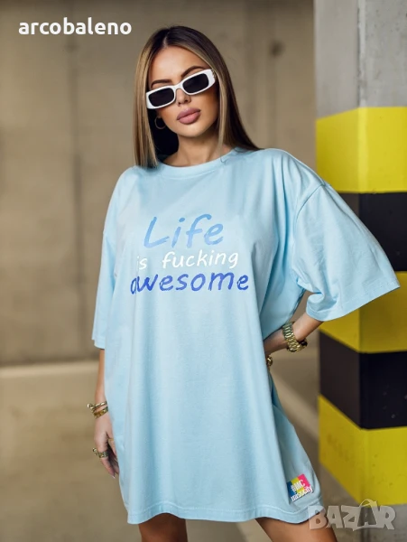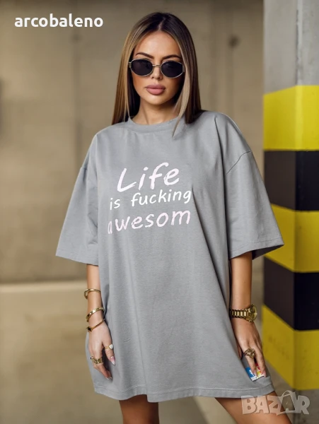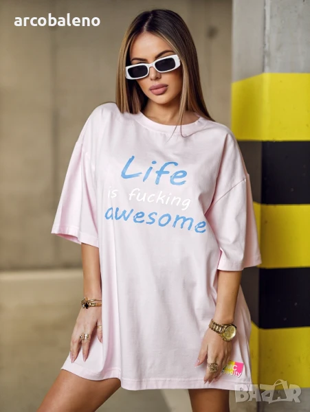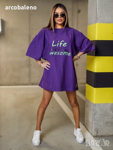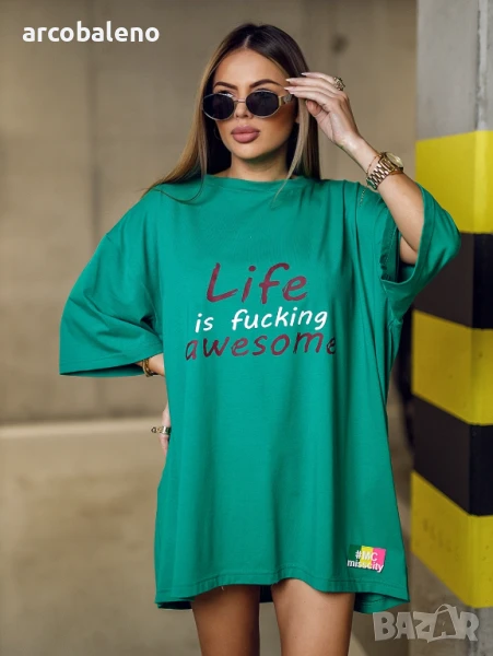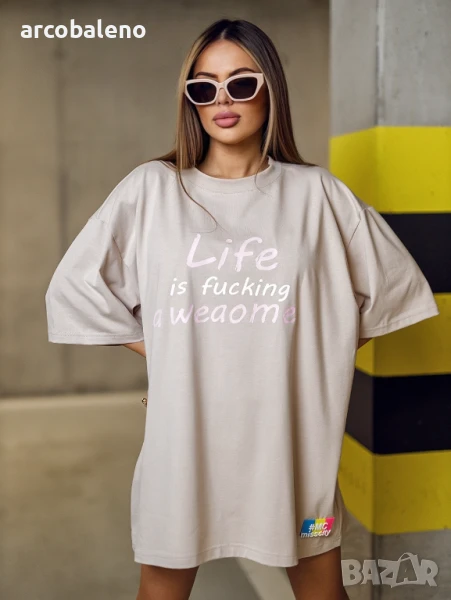 Дамска блуза LIFE - дълга дамска тениска с къс ръкав. Оувърсайз кройка. Апликация отпред - цветни надписи.