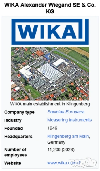 От известната немска марка, европейски първенец със световна известност от 1946 г., световен лидер в измерването на налягане, температура и стандартите за ниво, сила и дебит, в технологията за калибриране и газови разтвори за всички изисквания на индустриалната измервателна технология, високо прецизни професионални инструменти, комплектовка и специализирано оборудване и цялостни услуги за всички отрасли на промишлеността - група WIKA Alexander Wiegand SE & Co. KG.