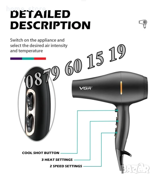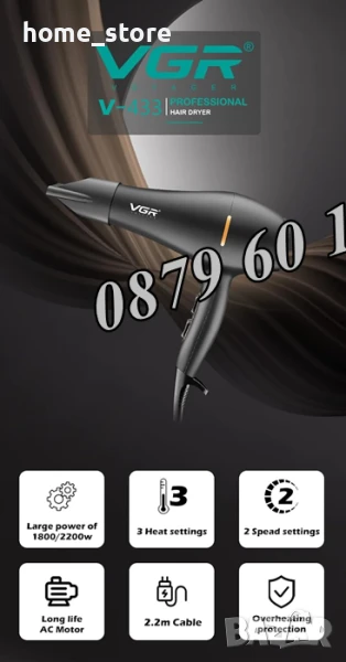Спестете ценно време сутрин или вечер, като изберете VGR V-433 1800 до 2200 вата професионален сешоар с 2 скорости + 3 настройки за нагряване и бутон за охлаждане, който фиксира стила на място. Усъвършенстваната Nano Ionic технология заедно с постоянен силен въздушен поток, който идва от професионалния мотор, ще направят косата ви копринено гладка, без влага.