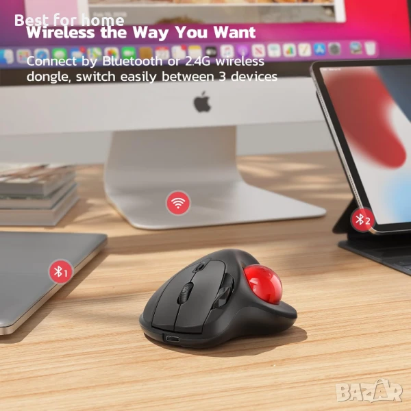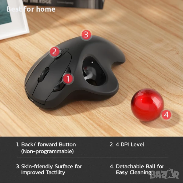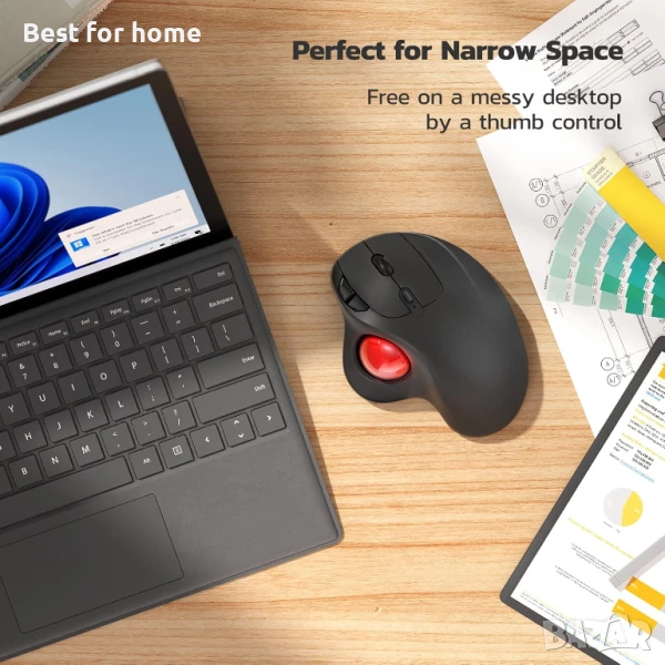 Ергономичен дизайн с плавно управление с палеца: Премествайте курсора си с плавния тракбол, вместо да движите китката и ръката си. Нека лесното и плавно управление с палеца помогне за намаляване на мускулното напрежение. Оптималният ъгъл на тракбол мишката ви позволява да държите дланта си в естествено положение за комфорт през целия ден.