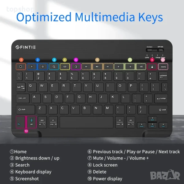 10-инчова ултратънка (4 мм) безжична Bluetooth клавиатура Fintie за iPad, Samsung, таблет, iPhone смартфон, iOS, Android телефон, черна. 230 часа издържа литиевата батерия.