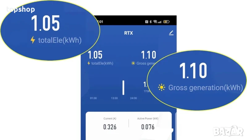 Енергиен мониторинг, независим за всяка фаза: напрежение (V), ток (A), мощност (kW) от всяко място.