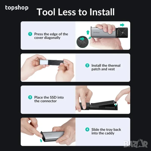 Инсталиране без усилие: Нашият процес на инсталиране без инструменти позволява лесен достъп и безпроблемна настройка. Просто натиснете капака, плъзнете гнездото, поставете вашия NVMe SSD, поставете термичната подложка, завийте гумения стикер и натиснете обратно капака за по-малко от минута