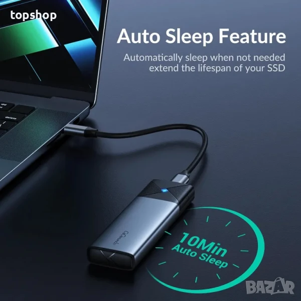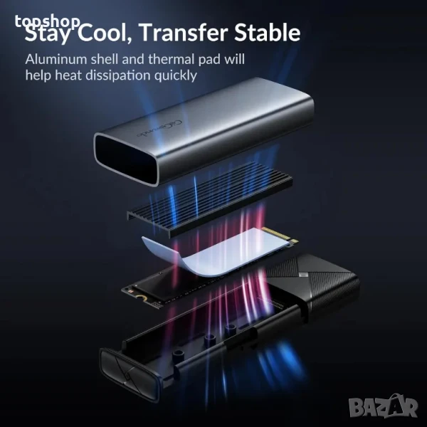 Светкавично бърз: С USB 3.2 Gen 2 10 Gbps честотна лента и UASP протокол, нашият NVMe корпус с една тава постига скорости до 1200 Mb/s за безпроблемен трансфер на данни. Комбинацията от алуминиева жилетка и радиатор осигурява стабилни скорости и ефективно разсейване на топлината